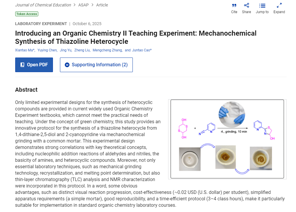 近日,公司马献涛博士、曹俊涛教授团队在化学教育国际顶级期刊 Journal of Chemical Education 发表了题为"Introducing an Organic Chemistry II Teaching Experiment: Mechanochemical Synthesis of Thiazoline Heterocycle"(J. Chem. Educ. 2025,DOI: 10.1021/acs.jchemed.5c00768)的最新教研成果。这是该教研团队自2024年以公司为第一单位首次在该期刊发表教研论文(J. Chem. Educ. 2024, 101, 2493−2497)之后的又一重要成果。
