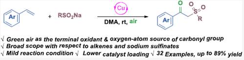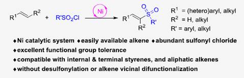 近日,公司饶伟浩博士课题组在有机化学领域知名期刊《The Journal of Organic Chemistry》上先后发表了题为“Nickel-Catalyzed Direct Sulfonylation of Styrenes and Unactivated Aliphatic Alkenes with Sulfonyl Chlorides”、“Aerobic Copper-Catalyzed Oxysulfonylation of Vinylarenes with Sodium Sulfinates under Mild Conditions: A Modular Synthesis of β-Ketosulfones”(DOI:10.1021/acs.joc.4c00094; 10.1021/acs.joc.4c01660)的研究成果。该研究先后利用磺酰氯和亚磺酸盐作为磺酰化试剂,通过发展配体调控的镍盐催化体系和铜盐催催化体系,分别实现了由烯烃的直接磺酰化反应和烯烃的氧磺酰化反应合成一系列非对称有机砜化合物,解决了非活化烯烃的直接磺酰化反应难题。