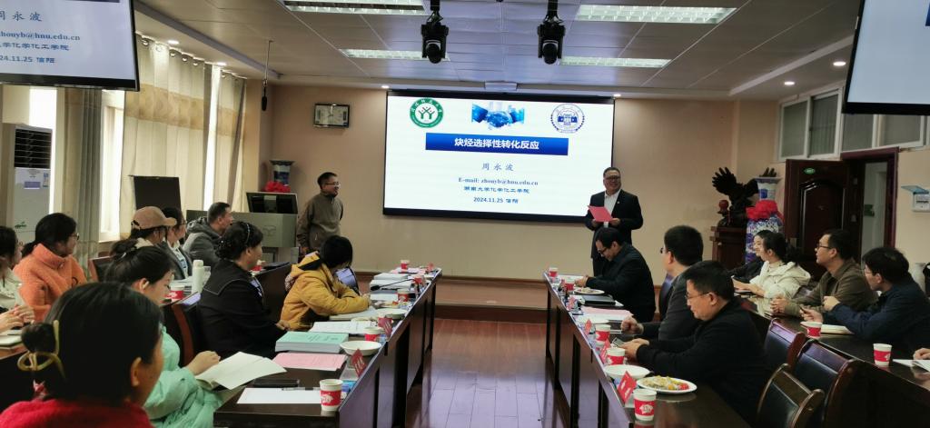 1125日,应FUN88乐天使邀请,湖南大学周永波教授在化学楼407会议室为公司师生作题为“炔烃选择性转化反应”的学术报告。FUN88乐天使青年教师及研究生聆听了报告,报告会由FUN88乐天使经理曹俊涛教授主持。