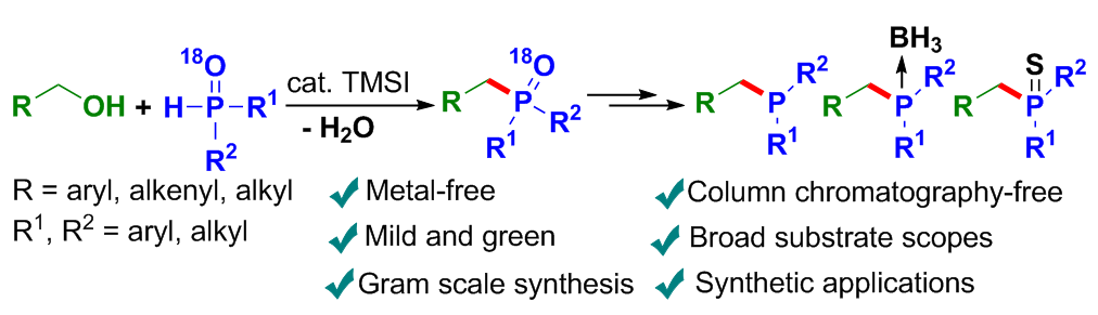 近日,公司马献涛副教授课题组联合温州大学徐清教授及浙江扬帆新材料股份有限公司韩立彪教授课题组在《Green Chemistry》上发表了题为“Metal-free Catalytic Nucleophilic Substitution of Primary Alcohols with Secondary Phosphine Oxides”(DOI:10.1039/D4GC04409F)的研究成果。该研究实现了在 TMSI 催化下,P (O) H 化合物与伯醇的直接 Michaelis–Arbuzov 反应。这一方法对苄醇、烯丙基醇甚至更为惰性的脂肪醇均具有良好的适用性,并且能够实现克级规模的制备以及向功能化有机膦分子的一锅法转化。尤为值得注意的是,多数产物仅依靠洗涤或重结晶操作便可获取高纯度产品,从而避免了柱层析的使用。该研究为三级氧膦化合物的合成提供了一条绿色且高效的新方法,表现出良好的应用潜力。机理研究表明反应涉及两种脱水途径。