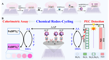 基于此,本课题组将前期发展的酶催化(ACS Appl. Mater. Interfaces, 2023, 15, 22959−22966; Anal. Bioanal. Chem., 2024, 416, 4759–4767)和化学氧化还原循环放大策略(Anal. Chem., 2021, 93, 9920-9926; Talanta, 2021, 233, 122564; Biosens. Bioelectron., 2022, 195, 113651; Biosens. Bioelectron., 2022, 214, 114514)相结合,开发了一种自供能PEC和比色双模式HSP检测平台。在这一平台中,酶催化产生的抗坏血酸(AA)作为PEC和比色检测的信号标签,可以在三(2-羧乙基)膦介导的化学氧化还原循环过程中再生。对于PEC检测,再生电子供体AA可以反复与Bi2S3/Bi2O3光阳极产生的空穴结合,有效地分离光生电子-空穴。此外,在比色检测过程中,引发了一种涉及AA的比色反应,将无色三(邻苯二甲酰亚胺)铁(III)还原为红色三(邻苯二甲酰亚铵)铁(II)。由于巧妙的信号放大策略,开发的这种双模式检测实现了对HSP90AA1(HSP家族的一种亚型)在实际样品中的PEC和比色测定,检测原理示意图如下: