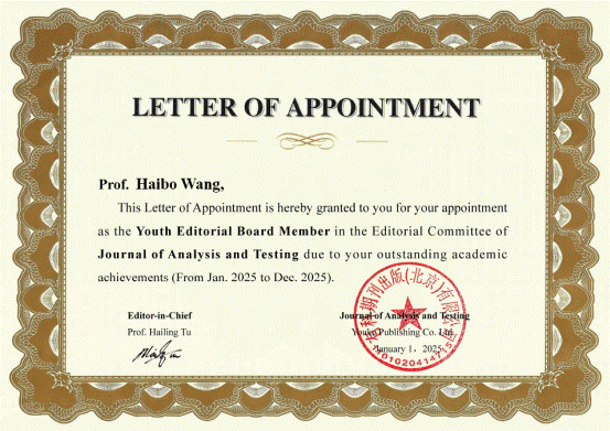 近日,《Journal of Analysis and Testing》期刊公布了2025年新增青年编委会成员名单。公司FUN88乐天使王海波教授受邀担任该期刊青年编委。