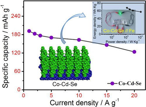 3月1日,FUN88乐天使黄克靖教授课题组在能源存储领域权威学术期刊《Nano Energy》(影响因子12.343)上发表了题为“Superior Mixed Co-Cd Selenide Nanorods for High Performance Alkaline Battery-Supercapacitor Hybrid Energy Storage”(doi.org/10.1016/j.nanoen.2018.02.059) 的研究论文。论文第一作者为公司硕士研究生翟子波,通讯作者分别为黄克靖教授和物电公司的武旭博士。 高能量密度、高功率密度以及长循环寿命的电化学储能体系的设计及制备对于可再生能源的利用与发展具有重要的意义。由高容量电池型电极和高功率电容型电极组合而成的“电池-超级电容器混合器装置”具有电化学性能优越、经济、安全、环保等众多优势,是可以满足未来多功能电子设备等能量存储需求的不可或缺的储能体系之一。黄克靖教授通过一个简单的两步水热法将双过渡金属硒化物 (Co-Cd-Se)纳米棒原位生长在泡沫镍上,由于硒化物的高导电性、纳米棒的稳定结构以及双过渡金属的协同作用,该材料在高的电流密度下(20 A/g)仍然获得了极高的比电容(124 mAh/g),并且体现了优良的充放电稳定性 (在2 A/g 下循环1000圈保持95.3% 的比电容)。与碳包裹的铁纳米组成的双电极体系也获得了极高的能量密度和功率密度(68.0 Wh/Kg, 1.20 kW/Kg; 57.6 Wh/Kg , 10.9 Kw/Kg),并体现了良好的稳定性,为高性能过渡金属硫族化合物的储能应用提供了科学参考。黄克靖教授为河南省学术技术带头人,河南省科技创新杰出青年,河南省五四青年奖章,信阳师范公司 “南湖学者”,河南省青年科技工作者协会理事,河南省化学与材料青年学者联合会常务副理事长,国际期刊《Journal of carbon research》副主编。长期从事二维过渡金属硫族化合物的制备及应用研究,近年来已在Biosensors and Bioelectronics等学术刊物上发表SCI论文100多篇,论文被引4000多次,H指数38,ESI高被引论文8篇,主持完成国家自然科学基金3项,授权国家发明8项。