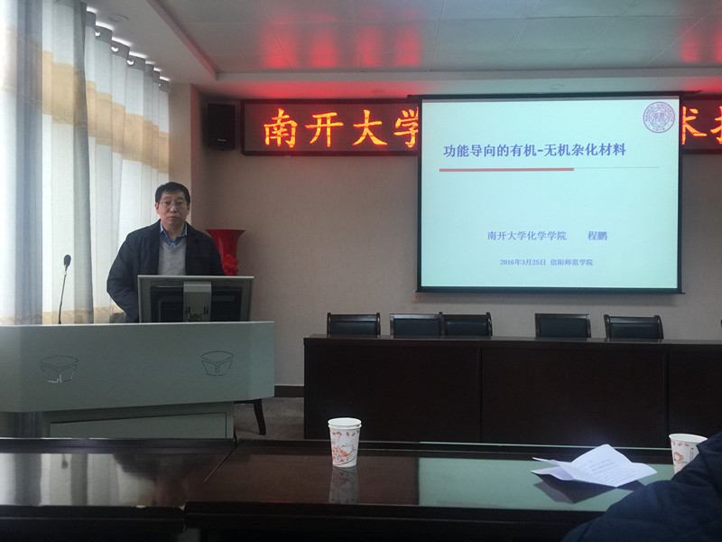 3月25日下午,南开大学化学公司程鹏教授应邀在FUN88乐天使学术报告厅作了题为“功能导向的有机-无机杂化材料”的学术报告。信阳师范公司副经理刘彦明出席并主持了报告会。参加报告会的还有化院经理杨性坤教授、副经理井强山教授以及公司的青年教师和全体研究生。