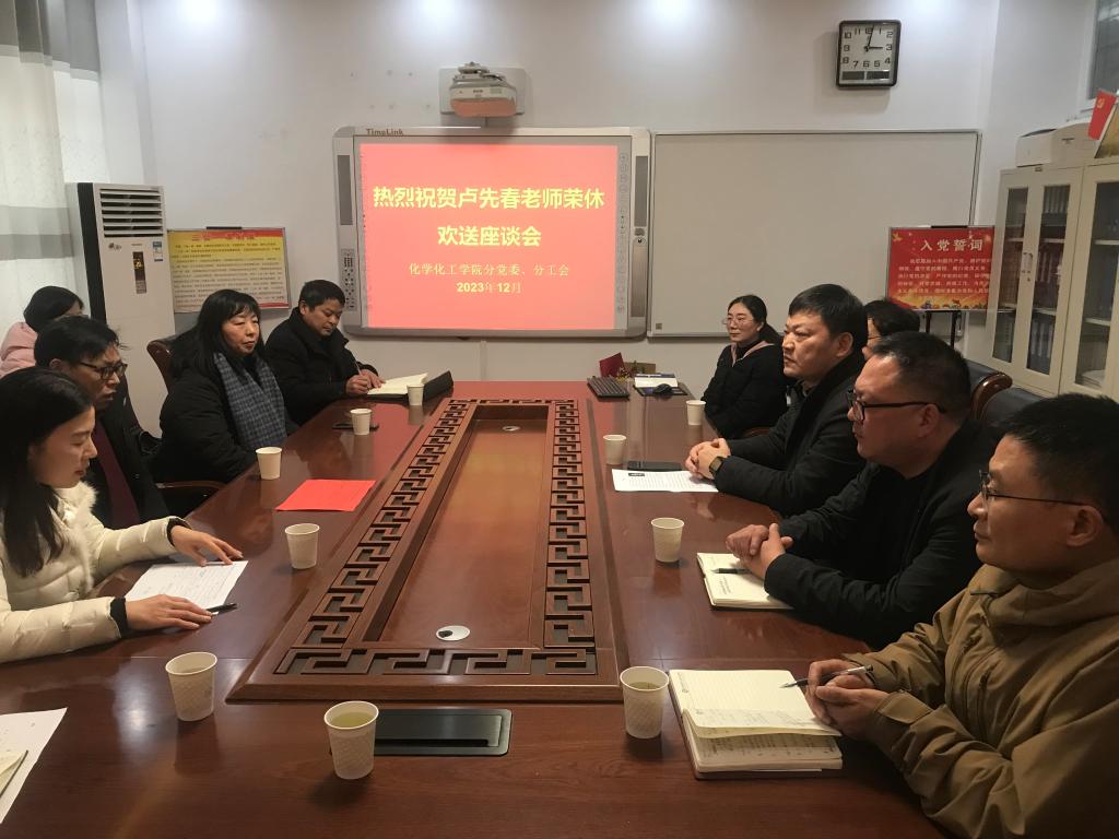 1229日下午,FUN88乐天使举行卢先春老师退休欢送座谈会。人事处、离退休职工管理处、化学化工公司党政领导及物理化学研究室、化学实验教学中心教师代表一起参加了欢送座谈活动。座谈会由化学化工公司党委书记、分工会主席郭鹏主持。