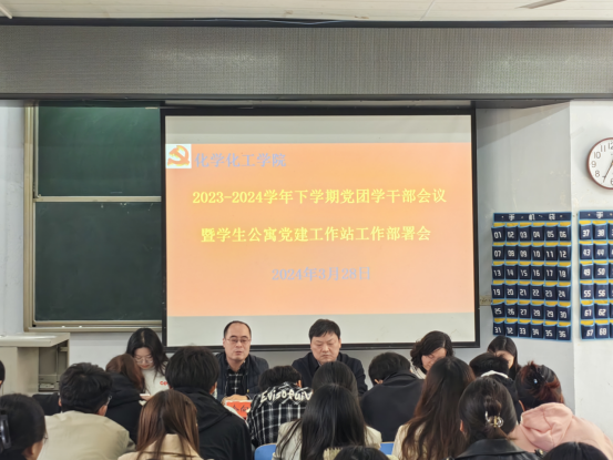 为进一步加强员工公寓党建工作,FUN88乐天使于3月28日在教四T1召开2023-2024学年下学期员工公寓党建工作部署会。化学化工公司党委书记郭鹏、副书记曲剧,专职组织员冷向宇,团委赵方方老师、专职辅导员翟成辉出席会议,全体员工党员、员工干部共同参加。