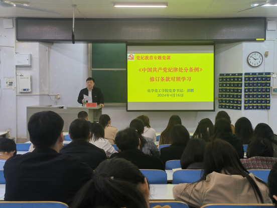 为深入开展党纪学习教育,强化全体党员纪律意识,进一步严明党的纪律规矩,化学化工公司党委4月16日在教四多媒体教室举办党纪学习教育专题党课。公司党委书记郭鹏为全体师生党员主讲“《中国共产党纪律处分条例》的修订条款对照学习”专题党课。