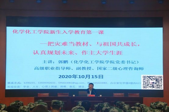 郭鹏宣讲学习贯彻《习近平总书记在全国抗击新冠肺炎疫情表彰大会上讲话》精神,以“弘扬伟大抗疫精神,做好人生规划,做主老员工涯”为主题,为2020级新生开讲了“新生入学教育第一课”。他强调,2020年是不平凡的一年,年初发生了突如其来的新冠肺炎疫情,病毒突袭而至,疫情来势汹汹,是百年来全球发生的最严重的传染病大流行,是新中国成立以来我国遭遇的传播速度最快、感染范围最广、防控难度最大的重大突发公共卫生事件。在党中央坚强领导下,迅速果断地采取严格措施,很好地控制住了疫情,党团结带领全国各族人民,进行了一场惊心动魄的抗疫大战,经受了一场艰苦卓绝的历史大考,付出巨大努力,取得抗击新冠肺炎疫情斗争重大战略成果,创造了人类同疾病斗争史上又一英勇壮举。回眸此次疫情大考,抗疫斗争伟大实践再次证明:中国共产党所具有的无比坚强的领导力,是风雨来袭时中国人民最可靠的主心骨;中国人民所具有的不屈不挠的意志力,是战胜前进道路上一切艰难险阻的力量源泉;中国特色社会主义制度所具有的显著优势,是抵御风险挑战、提高国家治理效能的根本保证;新中国成立以来所积累的坚实国力,是从容应对惊涛骇浪的深厚底气;社会主义核心价值观、中华优秀传统文化所具有的强大精神动力,是凝聚人心、汇聚民力的强大力量;构建人类命运共同体所具有的广泛感召力,是应对人类共同挑战、建设更加繁荣美好世界的人间正道。我国国家治理体系和治理能力再次显现出强大生命力。抗疫斗争中产生的“生命至上、举国同心、舍生忘死、尊重科学、命运与共”伟大抗疫精神,正成为推动国家治理现代化的强大精神力量。疫情防控人民战争、总体战、阻击战的重大战略成果,已时刻教育大家,对青年老员工的学业起航、人生发展具有十分重要的指导意义,希望大家要准确解读、自觉弘扬。要积极参与“把灾难作教材,与祖国共成长”主题教育系列活动,把新生入学教育中的理想信念教育、专业思想教育、学业指导教育、职业规划教育、人生导航教育、爱国主义教育、心理健康教育、安全意识形态等专题教育贯通起来,把握方向,打牢基础,扣好人生“第一粒扣子”,争做“有信念、有纪律、有品行、有作为”新时代“四有”好青年。