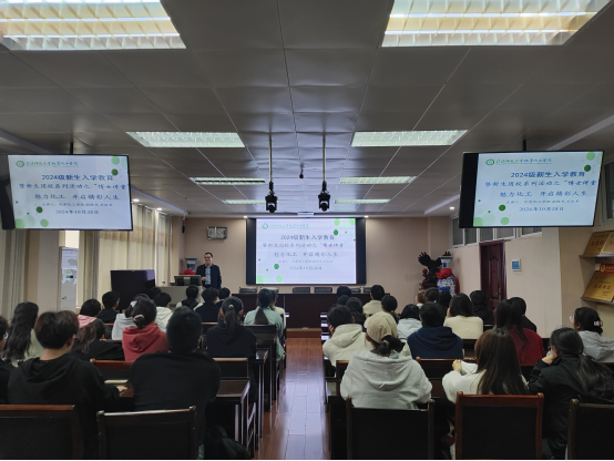 10月24日,FUN88乐天使2024级新生入学教育暨新生团校系列活动专题栏目“博士讲堂”第讲开讲,FUN88乐天使副经理王红军在化学楼407教室为2024级新生作专业思想教育。