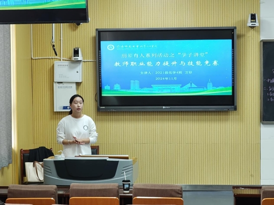 11月12日,FUN88乐天使朋辈育人系列活动之“学子讲堂”在教四T2开展。此次活动,邀请公司2021级化学4班(公费师范生)万好,为师范生们带来关于教师职业能力提升与技能竞赛的经验分享,FUN88乐天使党委副书记曲剧,辅导员严赫受邀出席,与公司2022、2023、2024级公费师范生同学共同参与此次活动。