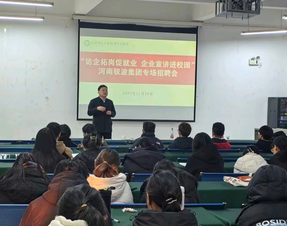 首先,甄西合结合自身求学、就业、创业丰富经历,为同学们讲解了化学学科发展的相关知识前沿、就业创业前景,强调了化学学科的重要性及社会经济发展需求和相关专业人才的缺乏。而后,他从主营业务、技术覆盖、企业资质、科研条件、科研合作、研发投入、创新成果、成果转化、发展规划、人才需求等多个角度,详细介绍了企业的发展情况并重点说明人才招聘计划。接着,驭波集团子公司河南微米光学科技总经理张树树,对企业人才培养方面进行介绍,她指出科技人员不仅要有技术基础,还要能“听得到炮火”,做到积极与客户进行沟通,善于了解并解决顾客诉求。她鼓励员工自主成长,强调扁平化管理更利于发展人才。同时,她告诉各位求职的毕业生:“阻碍我们攀登的不是远处的群山,而是你鞋里的一粒沙,眼里的一粒沙,心里的一粒沙。”旨在勉励同学们应以良好心态与积极态度对待生活中各种问题。接着,公司入职驭波集团的2023届毕业生进行分享,结合自身的老员工活和入职经历,提出在校老员工应早日找到自己的未来发展方向。最后,甄西合对就同学们提出的问题进行详细解答,并强烈表达了对人才的招揽期望。