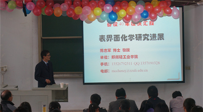 为庆祝信阳师范公司40周年华诞,广大员工回归母校祝贺。10月27日下午,知名员工陈志军于教四梯一开展了一场题为“表界面化学研究进展”的学术报告会。200余名师生共同聆听了此次学术报告,应用化学研究所副所长杨术明主持了此次会议。