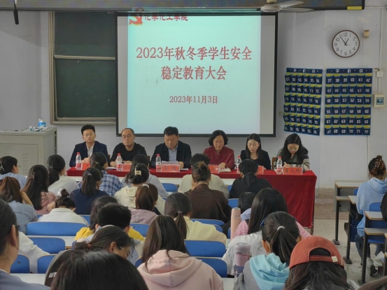 11月3日,FUN88乐天使在教四101召开2023年秋冬季员工安全稳定教育大会。化学化工公司党委书记郭鹏、副书记曲剧,专职组织员冷向宇,辅导员赵方方、严赫、翟成辉出席会议,各班班长团支书、员工会成员共同参加。