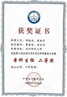 近日,由中国化工教育协会和西安交通大学共同主办的第三届全国老员工电化学测量技术竞赛(简称“ECMT竞赛”)圆满落幕。由2022级材料化学班邢晓冰、梁丽莎组成的参赛队在曹康哲和刘会俏两位老师的指导下,经过培训、初赛、决赛评审、决赛答辩等环节,最终荣获全国二等奖。
