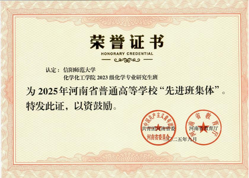 近日,共青团河南省委、河南省教育厅公布了2025年“河南省普通高等公司‘先进班集体’”的认定结果,公司2023级化学专业研究生班凭借出色的综合表现,从众多参评单位中脱颖而出,荣获这一省级荣誉称号。