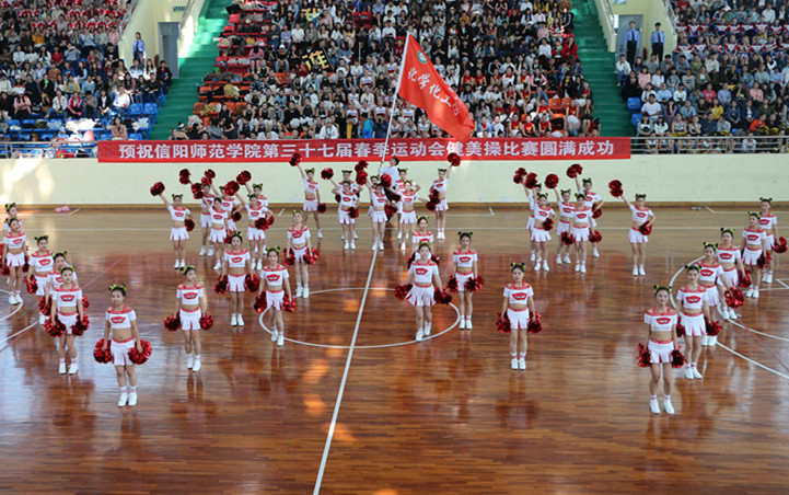 4月17日,信阳师范公司第三十七届春季运动会健美操比赛在体育馆隆重举行。赛前,校团委书记王建旭致开幕辞,随后各院系以六人一组为代表依次上场展现各院系特色风采,接着大家汇聚成方,伴着活力的音乐、踏着整齐的步伐、挥着美丽的花球,将生机勃勃的青春表现得淋漓尽致。开幕式过后,健美操比赛正式拉开帷幕。