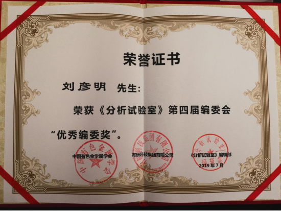 2019年7月30日,《分析试验室》期刊第五届编委会会议在北京召开。公司刘彦明教授荣获《分析试验室》第四届编委会“优秀编委奖”,并被续聘为该刊第五届编委。期刊名誉主编、中国工程院屠海令院士为四位获奖编委进行了颁奖。