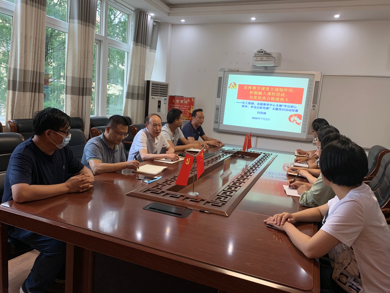 为庆祝中国共产党99周年华诞,深入学习贯彻习近平新时代中国特色社会主义思想,激励广大党员干部充分发挥先锋模范作用,主动担当作为,凝聚奋进力量。7月2日,化工原理支部和实验教学中心支部联合在实验楼“党员之家”召开“牢记初心使命、争当出彩先锋”主题党课教育。活动由党支部书记姜通武主持,两个支部的党员参加了本次活动。党委委员归风铁副经理以普通党员身份参加所属党支部主题党日活动,并主讲《发挥教学课堂主战场作用,积极融入课程思政,为党培养合格接班人》的专题党课。