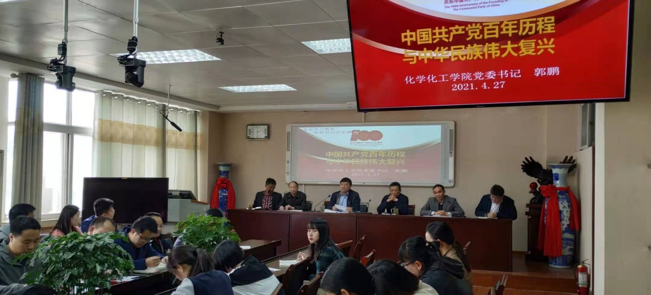 为庆祝中国共产党建党100周年,深入推进党史学习教育,根据化学化工公司党委“党史学习教育计划安排”,4月27日,化学化工公司党委书记郭鹏以《中国共产党百年历程与中华民族伟大复兴》为题,在化学楼407报告厅为公司师生党员开讲党史学习教育专题党课。