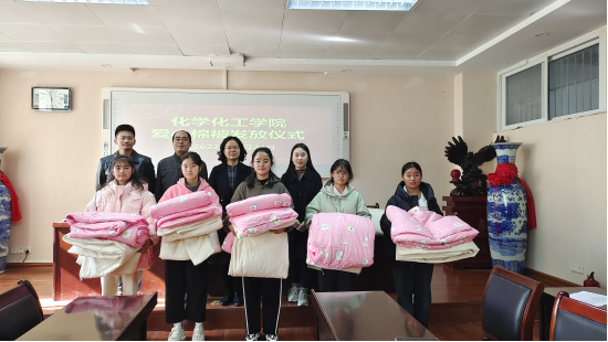 11月24日,我院在化学楼407会议室举行爱心棉被发放仪式。公司党委副书记曲剧,辅导员冷向宇、赵方方、严赫老师出席本次发放仪式。