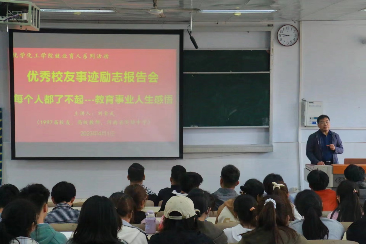 41日,FUN88乐天使在教6-101多媒体教室举办“每个人都了不起---教育事业人生感悟”优秀员工事迹励志报告会。报告会邀请到FUN88乐天使1997届优秀员工、河南省实验中学高级教师刘金武。报告会由化学化工公司党委书记郭鹏主持。2022级公费师范生、化学专业员工代表到会聆听并互动交流。